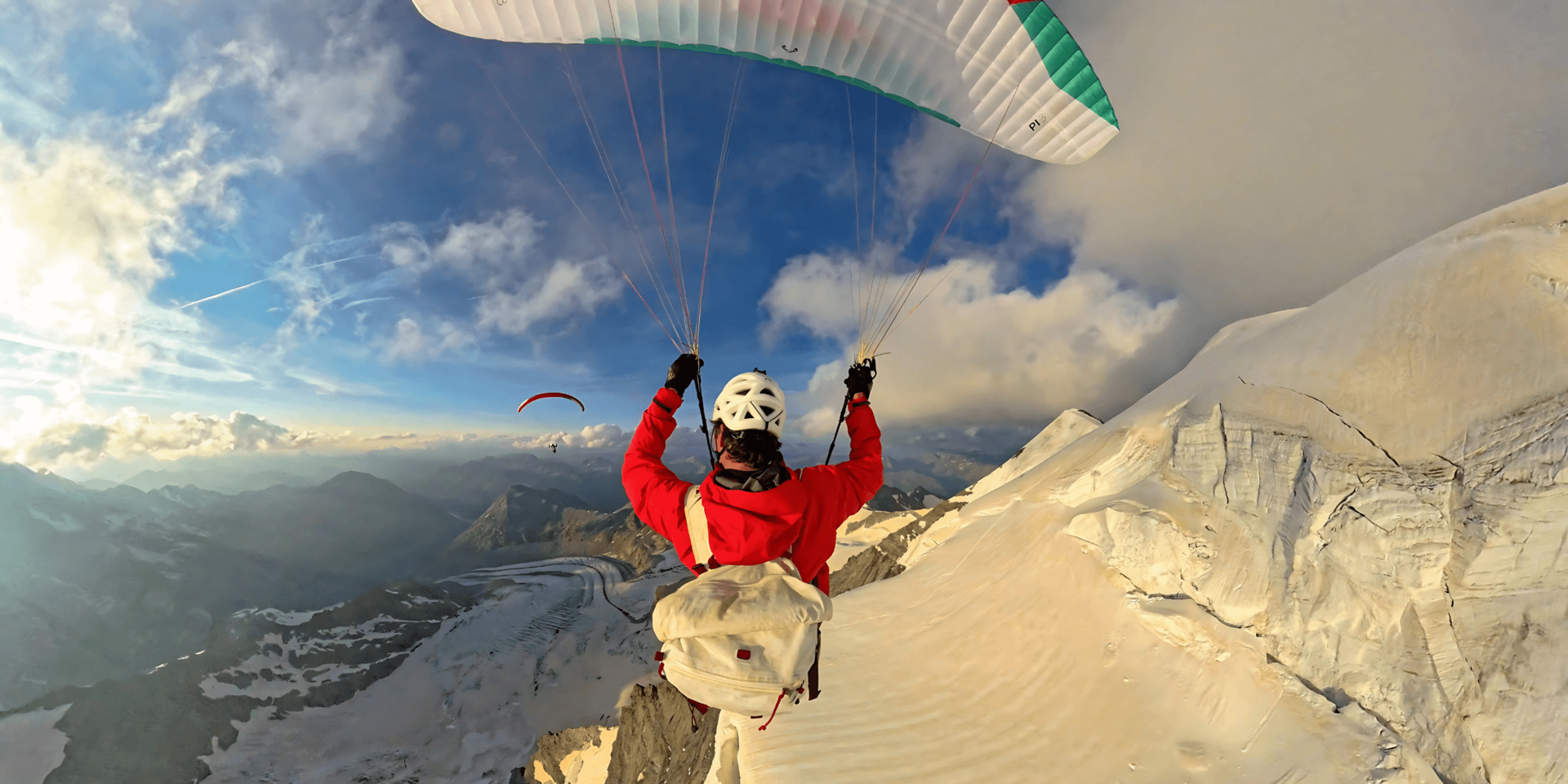 Zeit zum Innehalten? Fehlanzeige. Oben angekommen, bereiten Roger und Romano ihre Schirme vor. Vom Wind lassen sie sich zum Einstieg des Westpfeilers tragen. Dieser Abschnitt der Palü Trilogie hat es in sich, vor allem zu dieser Jahreszeit – für Roger klettertechnisch herausfordernder als erwartet. Es ist der am wenigsten bestiegene Pfeiler der drei. Stark ausgeapert, brüchig und von massivem Steinschlag heimgesucht. Aufgrund der schwierigen Bedingungen wägt das Team ab, ob es nicht besser sei umzukehren. Eine andere Option ist, in der Pfeilermitte einfach über einem Serac rauszufliegen. Nach kurzem Abwägen erscheint es dem Team als vernünftiger bis zum Gipfel aufzusteigen und dort zu starten. Nach mehreren Stunden anspruchsvoller Kletterei durch Felsen, Schnee und Eis und erreichen sie mit brennenden Muskeln auch den zweiten Gipfel. Müde, aber euphorisch wird beiden klar: Jetzt den Ostpfeiler auslassen wäre mehr als nur schade.